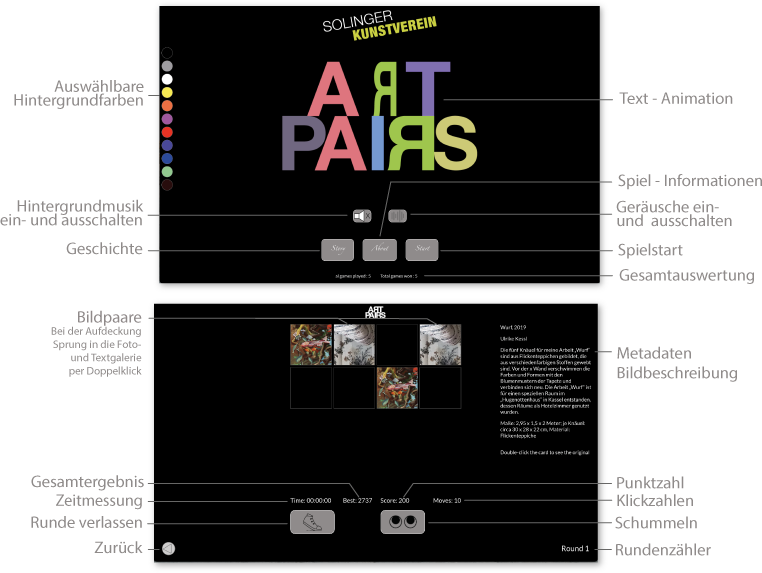 Art Pairs is a card game in the context of Kunstverein Solingen. All the cards are laid face down on a surface and the player flips two cards at each turn. The objective of the game is to find matching pairs of cards. Art Pairs connects the cards to the digital dataset from Artists creating common ground in a fun way. Once played, the amazing artworks will remain in people's minds 1 1